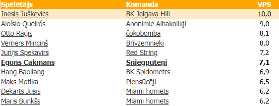 Lai arī pirmo reizi kluba pastāvēšanas vēsturē neviens no Sniegputeņu spēlētājiem nav atrodams starp desmit rezultatīvākajiem spēlētājiem, Egons Cakmans jau trešo sezonu mūs priecē ar atrašanos starp līgas labākajiem piespēlētājiem.